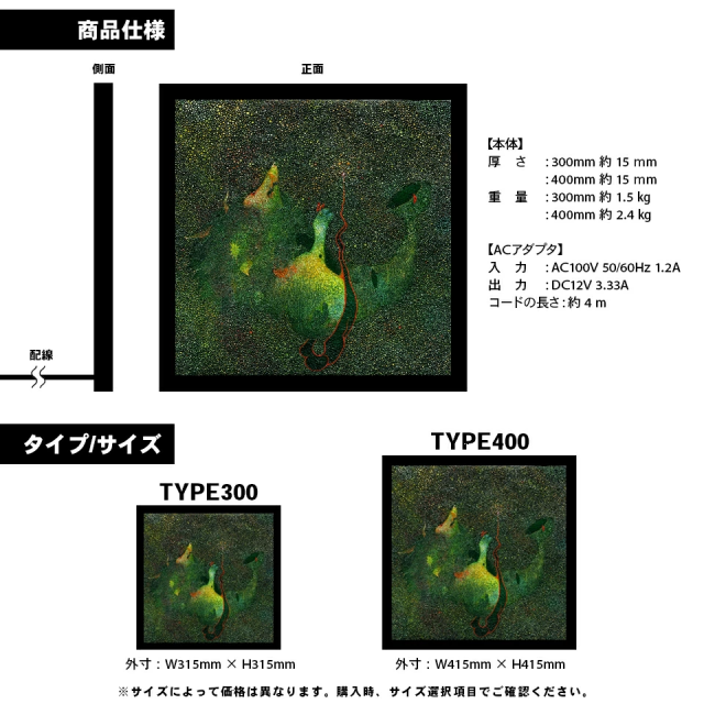| サイズ | 【本体】 厚さ:300mm 約 15 mm 400mm 約 15 mm 重量:300mm 約 1.5 kg 400mm 約 2.4 kg 外寸:300mm W 315 mm × H 315 mm 400mm W 415 mm × H 415 mm 【ACアダプタ】 入力:AC100V 50/60Hz 1.2A 出力:DC12V 3.33A コードの長さ:約 4 m |