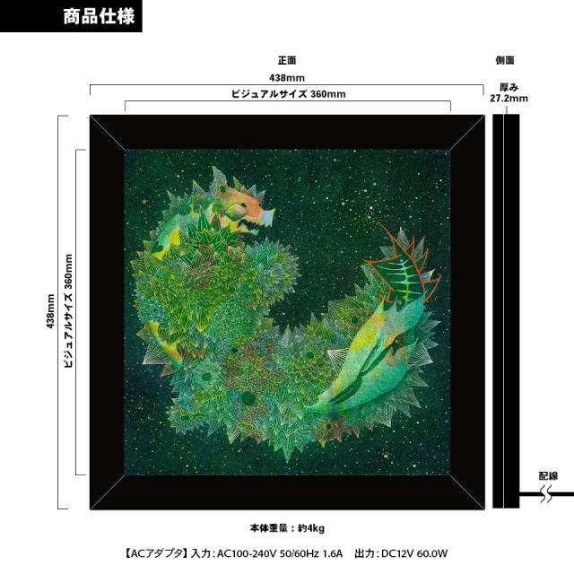 | サイズ | 【本体】 厚さ:約 27.2 mm 重量:約 4 kg 外寸:W 438 mm × H 438 mm ビジュアルサイズ:W 360 mm × H 360 mm 【ACアダプタ】 入力:AC100-240V 50/60Hz 1.6A 出力:DC12V 60.0W |