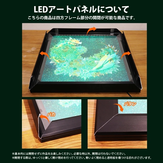| 注意事項 | 下記をご理解・ご了承の上、購入して下さい。 ●こちらの商品は受注生産品の為、ご注文確定から3~4週間程で発送致します。お時間頂く商品の為、ご了承の上ご購入下さい。 ●本商品は受注製作商品です。製作後のキャンセル、返品はお受けできませんのでご了承ください。 ●カラーの見え方につきましては、お客様のモニターなどの設定により、違って見える場合もございます。予めご了承くださいませ。 ●当商品のご使用については、ご使用者の管理の元、責任をもってお使いください。 ●当商品の使用目的以外のご使用はお控えください。 ●当商品の上にものを置かないでください ●屋内仕様です。屋外での使用はお控えください。 ●透明面板の間に水分が入り込むと作品の見映えにも影響します。 長期的にもご使用頂けるよう定期的に布などで拭き取ってください。 ●長くお使い頂く為に、点灯してから1日20時間以内に必ず消灯するようにしてください。 ●壁面に取り付けする際の金具、器具はお客様ご自身でご用意ください。 ●付属しているACアダプタ以外でのご使用はお控えください。故障の原因になります。 ●ACアダプタをコンセントにつなぐ際はジョイント部分を繋いでからコンセントに差し込んでください。 ●点灯時、商品に布や紙なので覆ったり、被せたりしないでください。火災の原因になります。 ●当商品の利用による、怪我・破損・汚損・紛失等については補償致し兼ねます。予めご了承ください。 ●長時間使用(24時間以上の連続使用)はお控えください。 ●直射日光が当たる場所はお控えください。色あせる可能性がございます。 ●保証期間は購入後、1年間です。(点灯しなくなった等の場合は購入店舗にご連絡ください。対象:当商品のみ) |