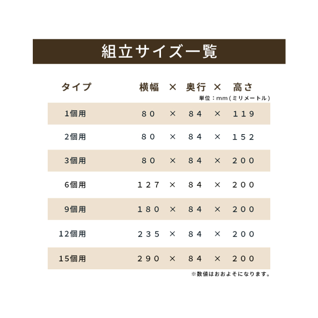 | サイズ ※組み立て時 | 1個用:約 横幅80×高さ119×奥行84mm 2個用:約 横幅80×高さ152×奥行84mm 3個用:約 横幅80×高さ200×奥行84mm 6個用:約 横幅127×高さ200×奥行84mm 9個用:約 横幅180×高さ200×奥行84mm 12個用:約 横幅235×高さ200×奥行84mm 15個用:約 横幅290×高さ200×奥行84mm |