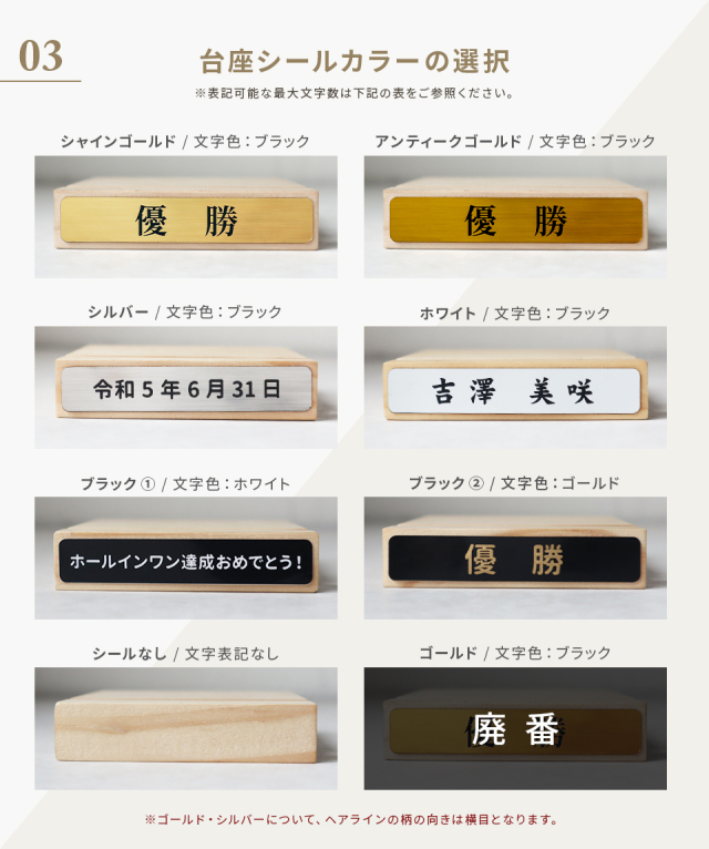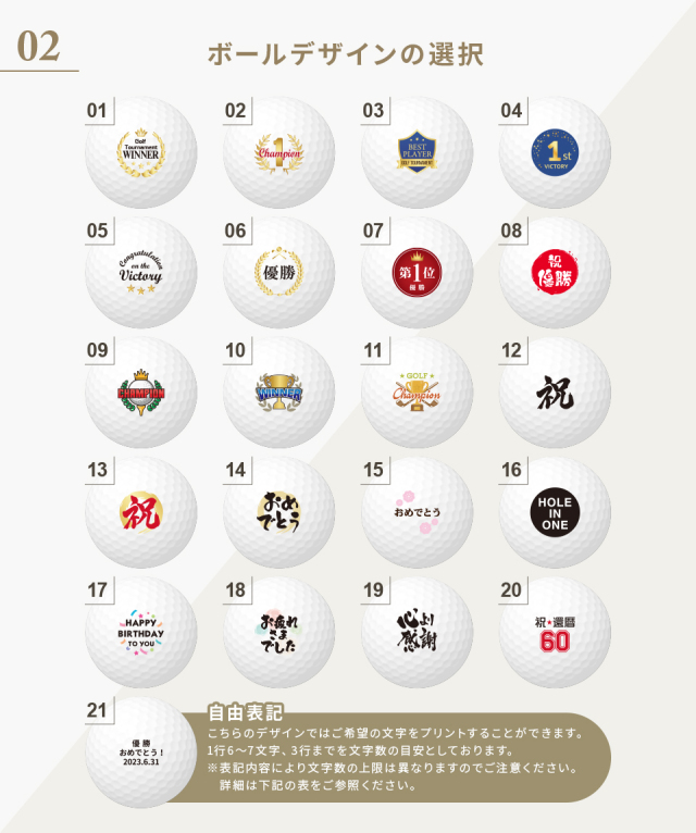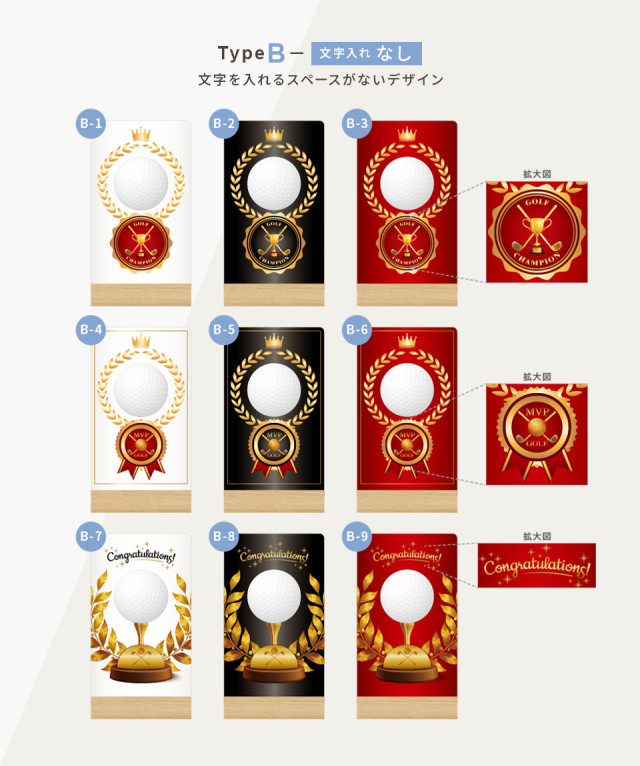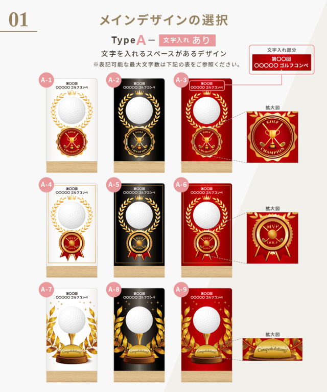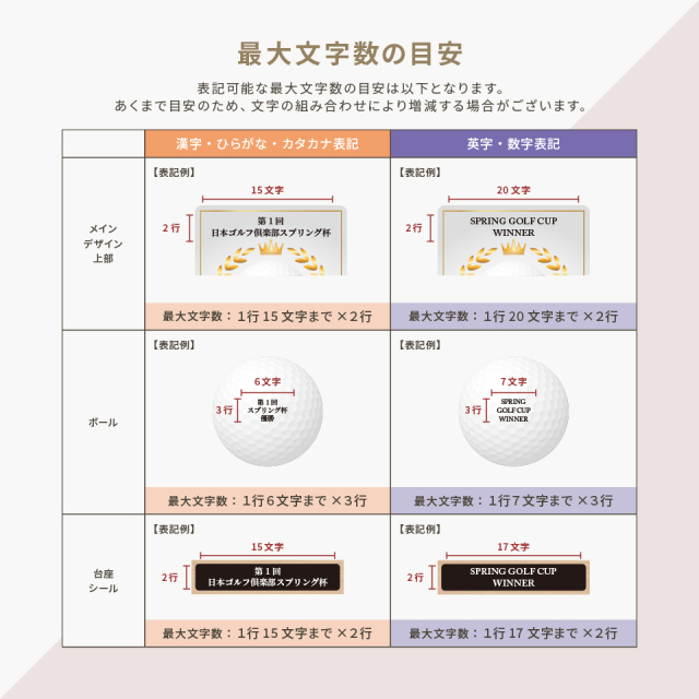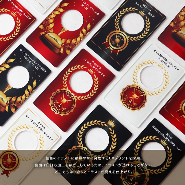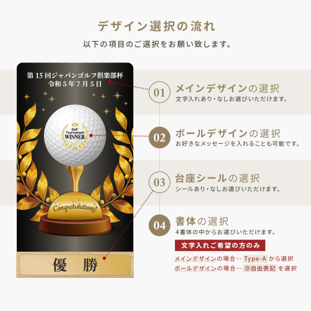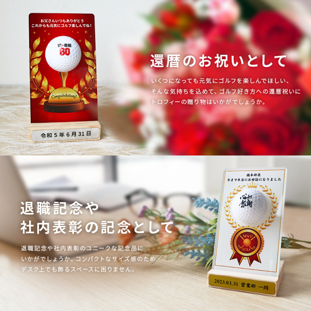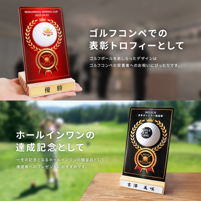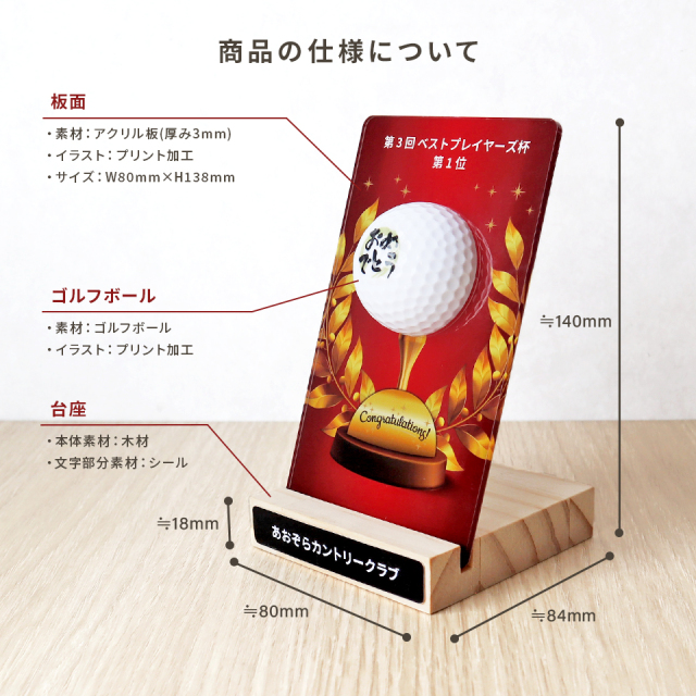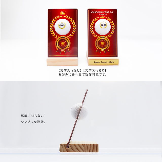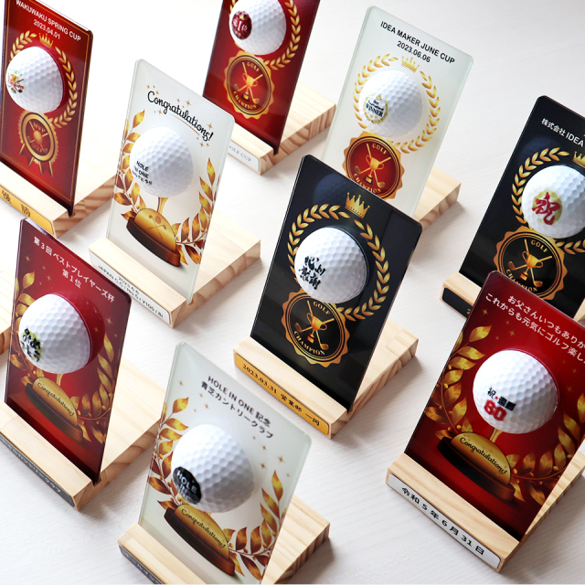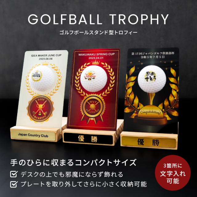 ゴルフボールを使用した新しいデザインが目を引くトロフィー。デザインやメッセージをお選びいただき、一品ずつオーダーメイドで製作いたします。ゴルフコンペの優勝記念やゴルフ好きの方への贈り物としてもおすすめです。商品仕様