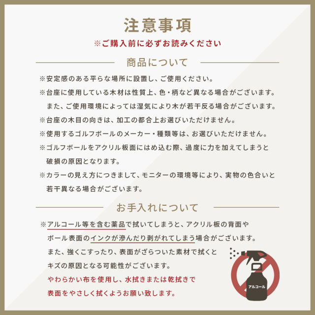 | 材質 | 板面:アクリル板(厚み 約3mm) ボール:ゴルフボール 台座:木材 |
