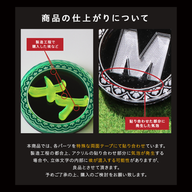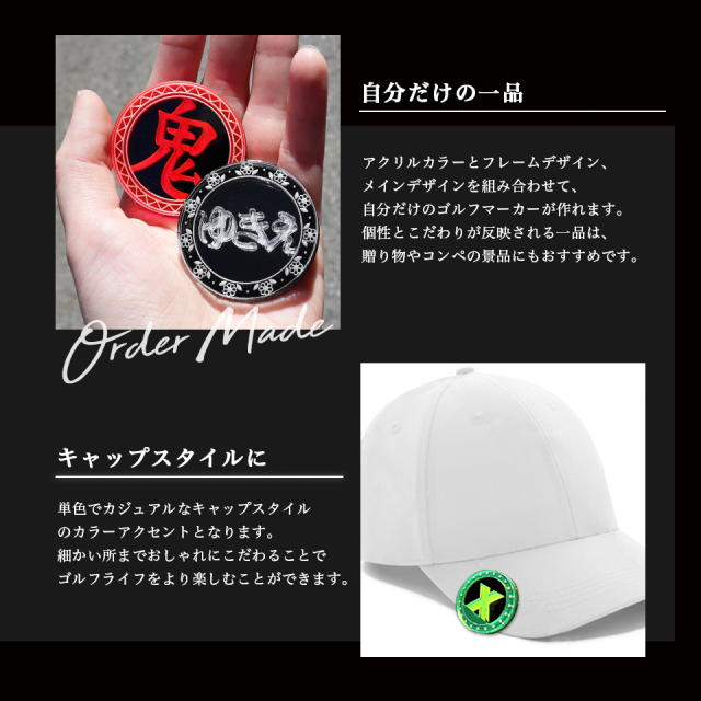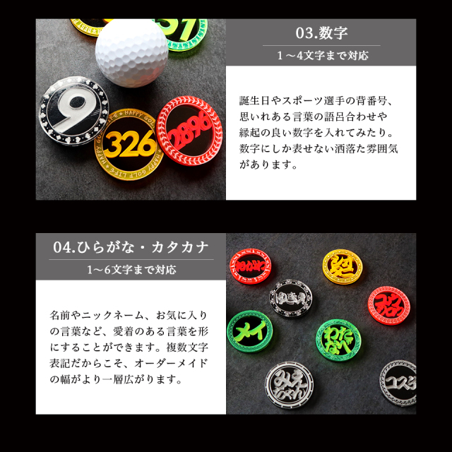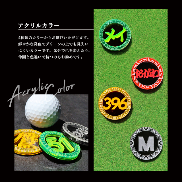 カラーアクリルに施された精巧な切り文字造形がおしゃれなゴルフマーカー。鮮やかなカラーがグリーン上でもしっかり目立ちます。商品仕様