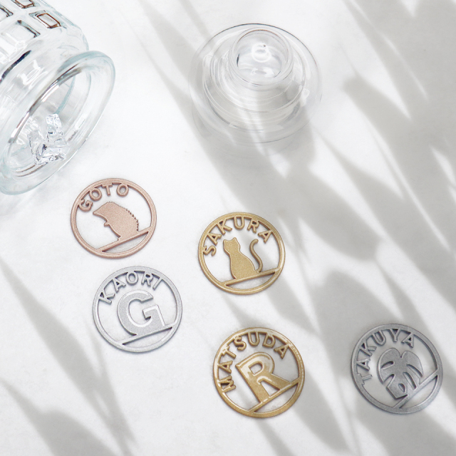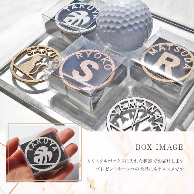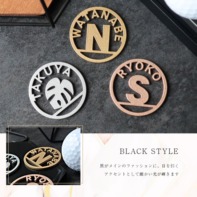 大きなイニシャルやシルエットとアーチに沿って表記された英字の組み合わせがおしゃれなゴルフマーカー。上品なメタリックカラーがキラキラと細やかな光を放ちます。商品仕様