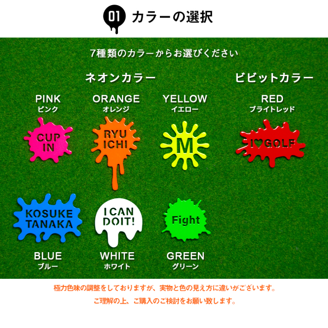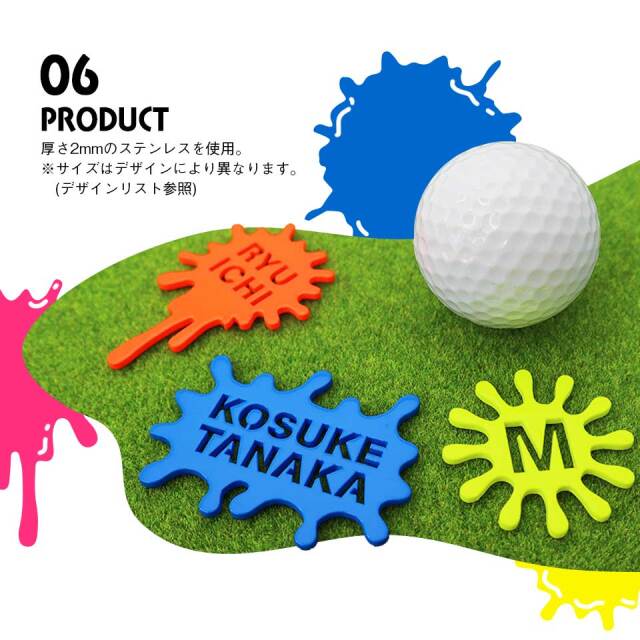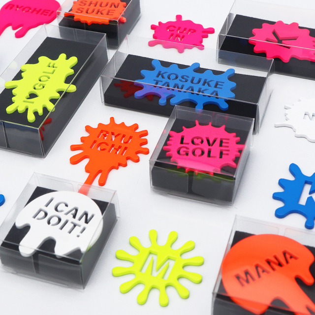 はじける様な形状にお好きな英字を名入れ出来る、遊び心のあるデザインのゴルフマーカー。グリーンに鮮やかに映える蛍光カラーがよく目立ちます。商品仕様