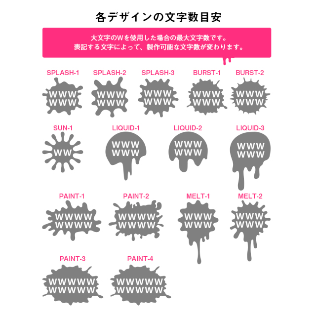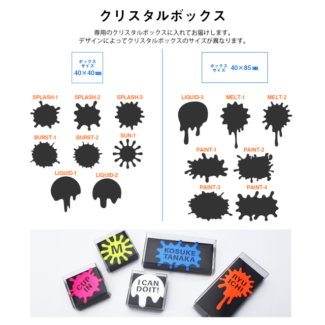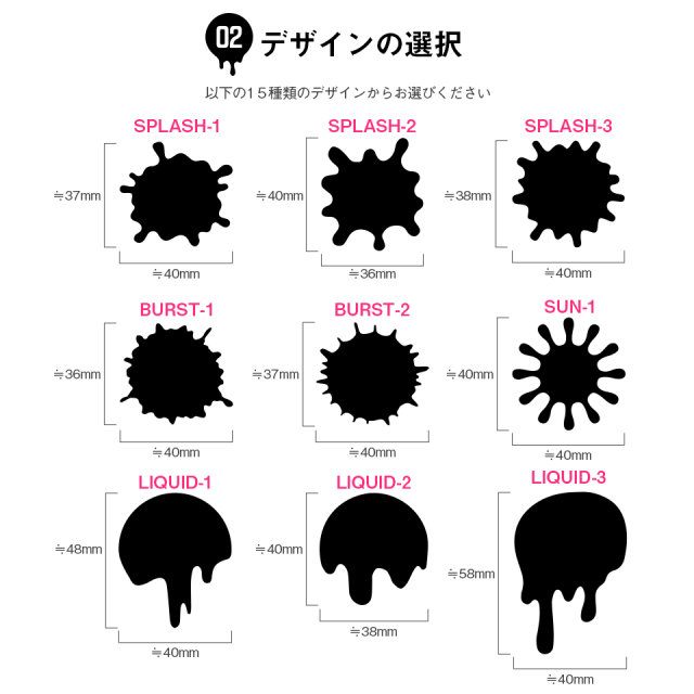 | サイズ | SPLASH-1:約 横幅40mm×高さ37mm SPLASH-2:約 横幅36mm×高さ40mm SPLASH-3:約 横幅40mm×高さ38mm BURST-1:約 横幅40mm×高さ36mm BURST-2:約 横幅40mm×高さ37mm SUN-1:約 横幅40mm×高さ40mm LIQUID-1:約 横幅40mm×高さ48mm LIQUID-2:約 横幅38mm×高さ40mm LIQUID-3:約 横幅40mm×高さ58mm MELT-1:約 横幅40mm×高さ63mm MELT-2:約 横幅40mm×高さ60mm PAINT-1:約 横幅58mm×高さ40mm PAINT-2:約 横幅54mm×高さ40mm PAINT-3:約 横幅60mm×高さ40mm PAINT-4:約 横幅57mm×高さ40mm |