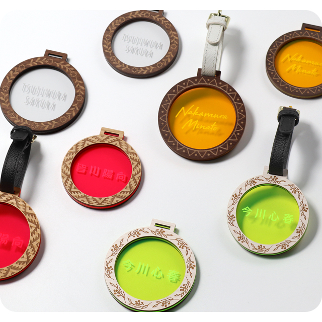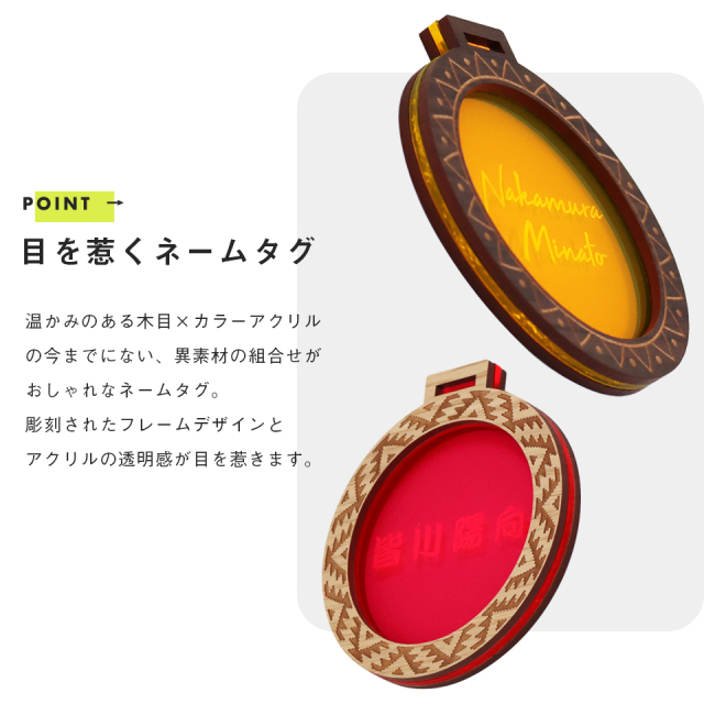 温かみのある木目×カラーアクリルの今までにない、異素材の組み合わせがおしゃれなネームタグ。彫刻されたデザインとアクリルの透明感が目を惹きます。商品仕様