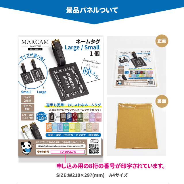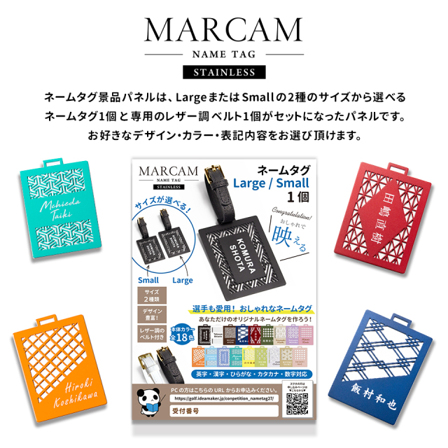 ゴルフコンペで喜ばれる景品パネル。名入れステンレスネームタグのLargeサイズ/Smallサイズのどちらか1つを景品としてご注文できます。商品仕様