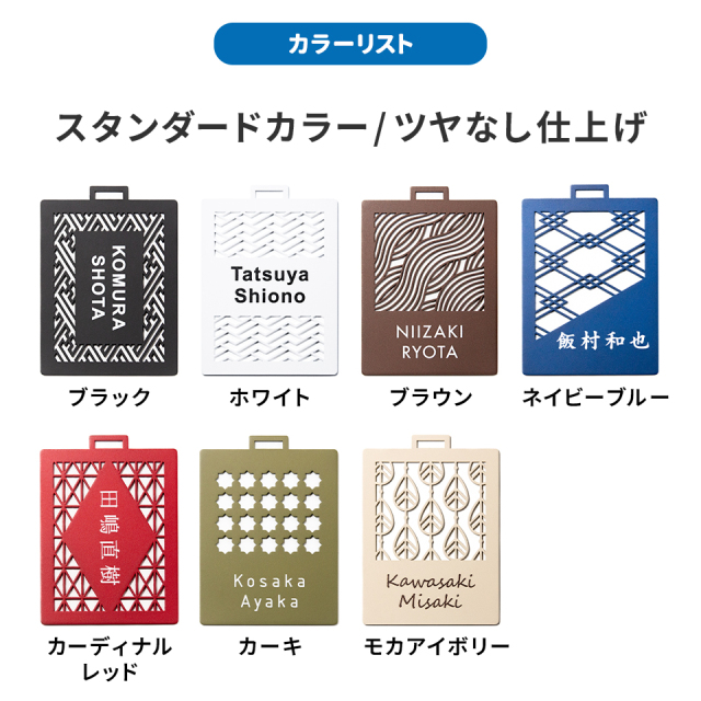 | ネームタグ 本体カラー | ブラック/ホワイト/ブラウン/ネイビーブルー/カーディナルレッド/カーキ/モカアイボリー/パープル/ピンク/オレンジ/スカイブルー/ブルー/ターコイズ/イエロー/ライムグリーン/アンティークゴールド/シャインシルバー/ピンクゴールド |
