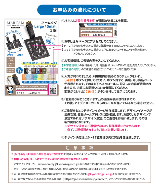 - 景品はパネルに記載のURLからお申込み頂き、メールでのやり取りにてがデザイン決定した後、10~15営業日以内に発送致します。